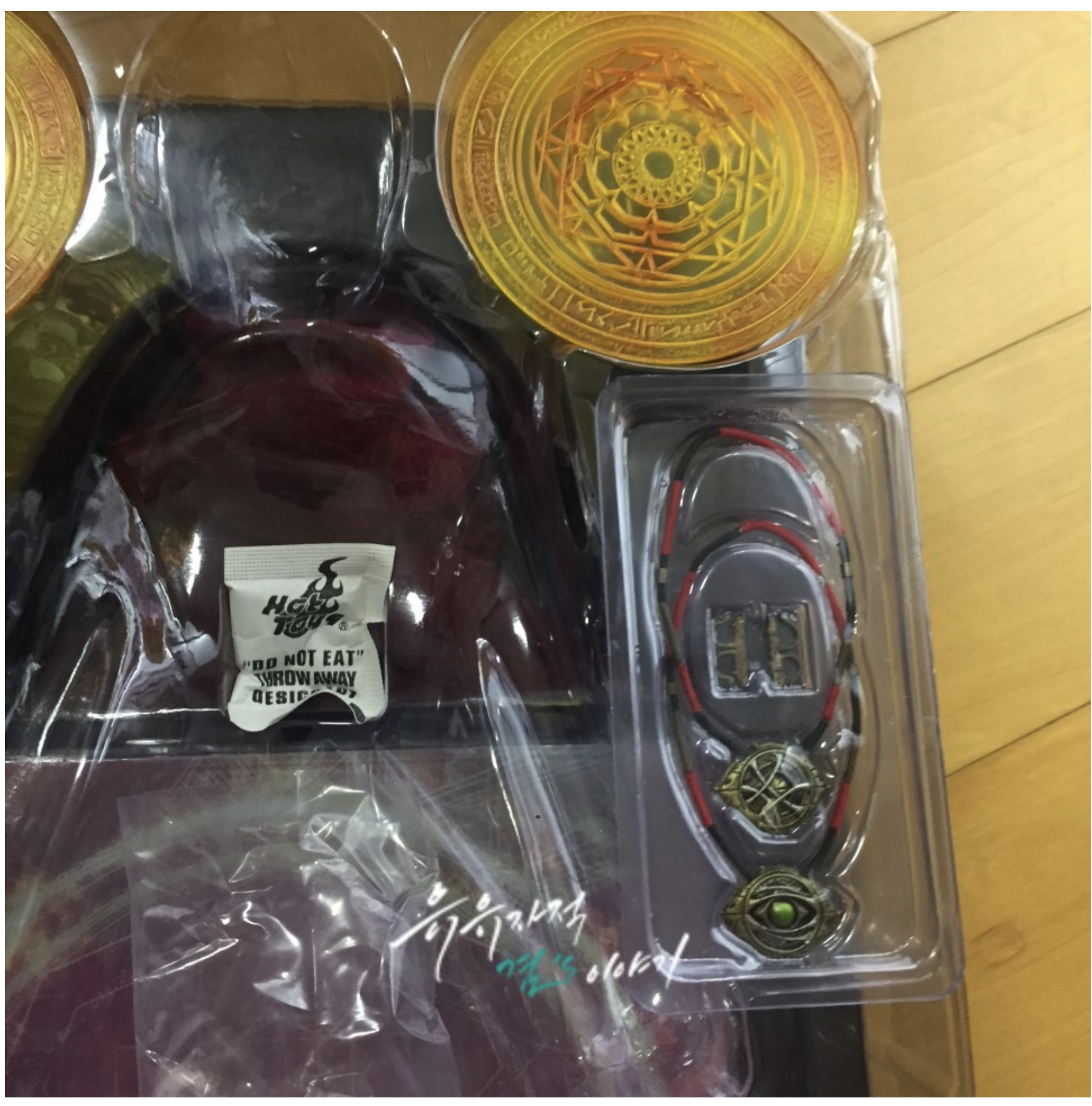 영화에 나오는 닥터스트레인지를 그대로 재현에 놓은 모습으로 윗층에는 피규어본체 및 각종루즈, 밑층에는 망토와 스탠스가 들어있습니다. 퀄리티 높은 구성으로 닥터스트레인지의 손동작 루즈가 아주 마음에 듭니다. 루즈중에 마법진이 있는데 처음에 '이거 어떻게 끼우지?' 생각했는데 보면 손가락 모양으로 끼울수 있는 부분이어서 탈부착이 가능합니다