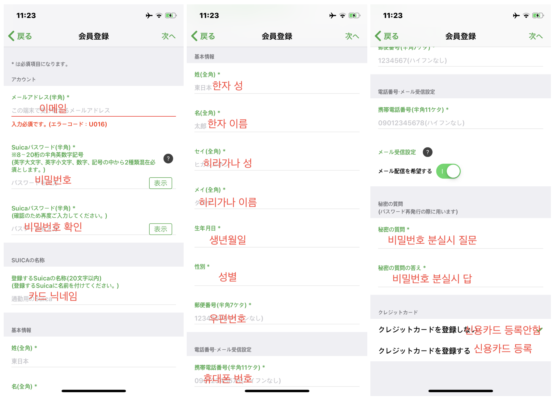 대충 위의 회원정보를 입력하면 되는데 저야 일본에 거주하고 있어서 입력하는데 크게 문제는 없지만 한국에서 여행 오시는분들은 이름, 우편번호, 휴대폰번호 이 3가지가 가장 문제될것 이라고 생각합니다. 이름은 밑에 링크 참고하셔서 한자, 히라나가로 채우시면 되고 우편번호 같은 경우에는 그냥 구글맵으로 게스트하우스나 호텔 찾으셔서 아무 우편번호나 넣으시면 됩니다. 휴대폰 번호는 그냥 한국 휴대폰 번호 그대로 넣어도 됩니다. 그래도 모르겠다 하시면 덧글로 남겨주세요. 그리고 가장 밑에 부분은 신용카드 등록인데 신용카드로 바로 충전도 가능하기 때문에 저는 해놨습니다. 편의점에서 쉽게 충전이 가능하기 때문에 안하셔도 상관은 없습니다.
