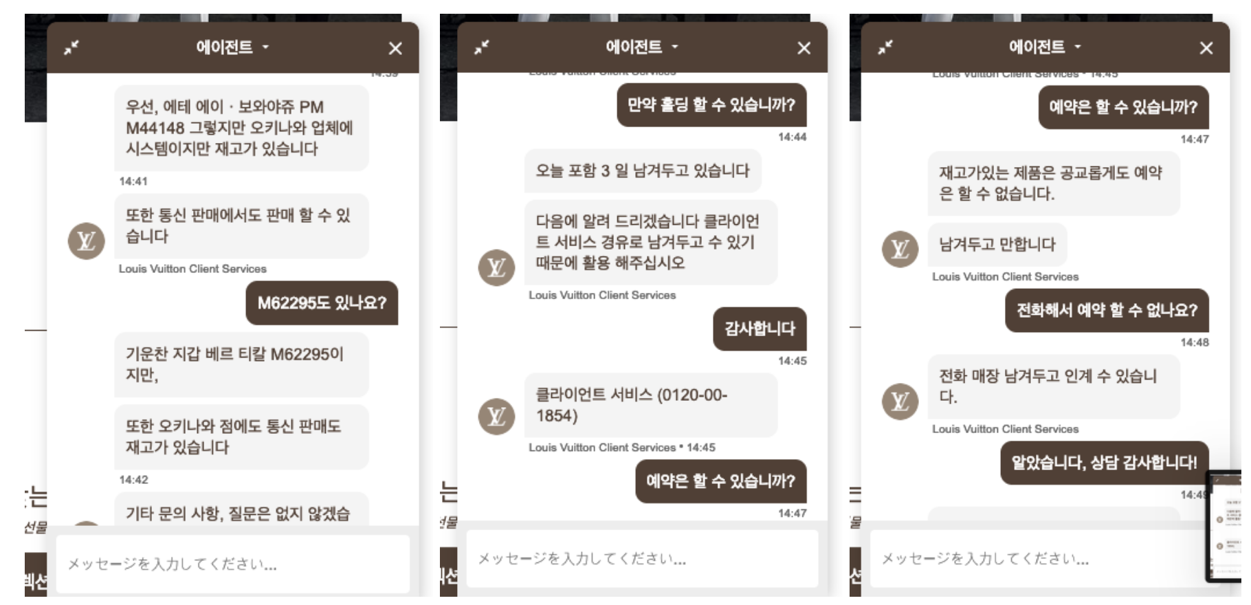 이 두 모델 재고가 있는지 물어봤습니다. 일단 두제품 둘다 재고가 있다고 해서 홀딩여부에 대해서 물어봤습니다. 홀딩은 무조건 전화로 요청을 하면 5일정도 가능하다고 합니다. 이 부분은 매장에 방문에서 물어봤는데 매장별로 상이할수도 있으니 참고하시길 바랍니다. 참고로, 온라이 채팅상으로 매장번호를 물어보실때는 반드시 매장 다이렉트 번호를 물어보시길 바랍니다. 루이비통에 백화점 안에 있는 경우도 꽤 많아서 백화점 대표번호를 알려주는 경우도 있으니 주의하시길 바랍니다. 그럼 다음에는 일본 루이비통 방문 및 구매후기에 대해서 남겨보도록 하겠습니다.