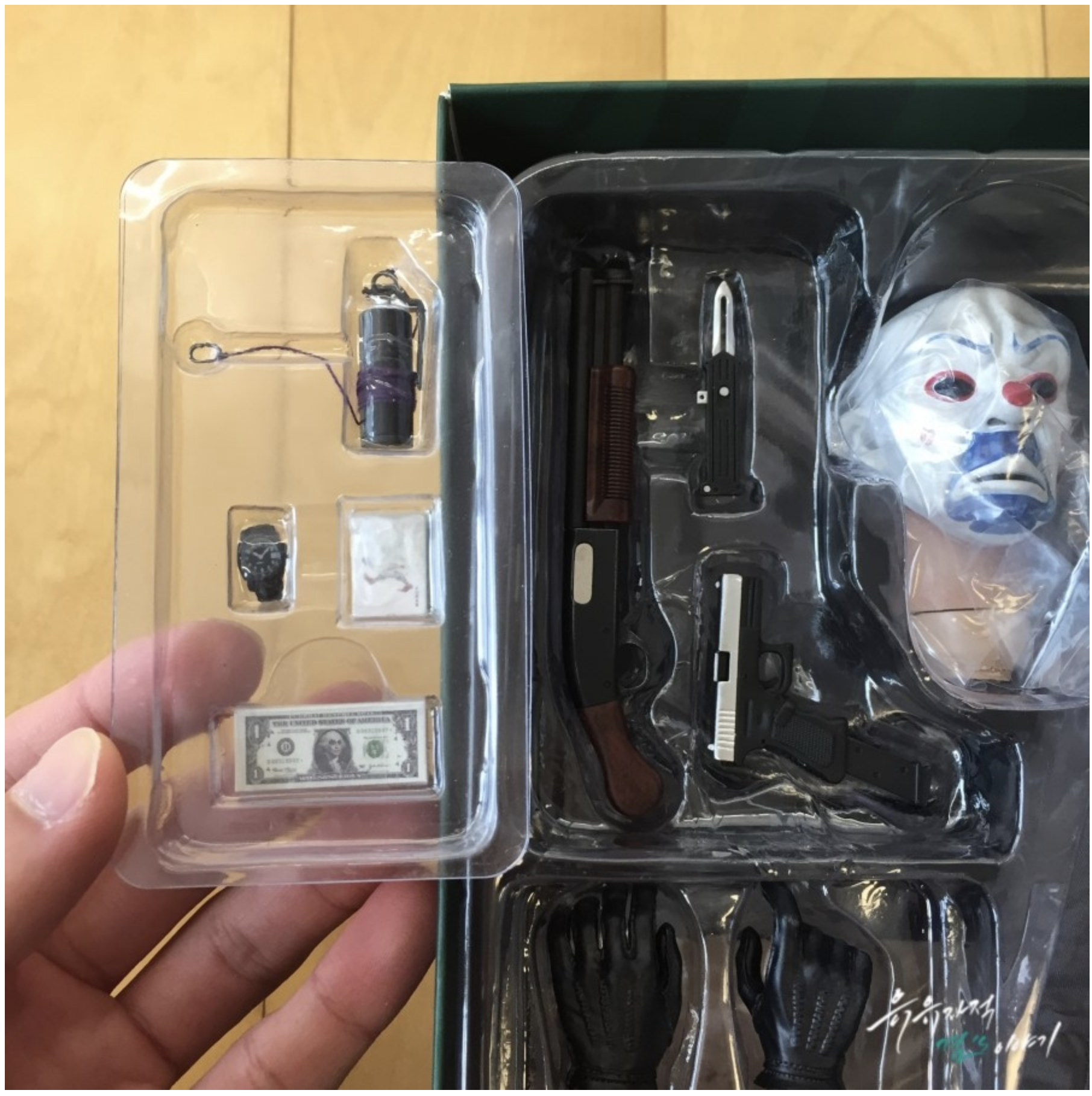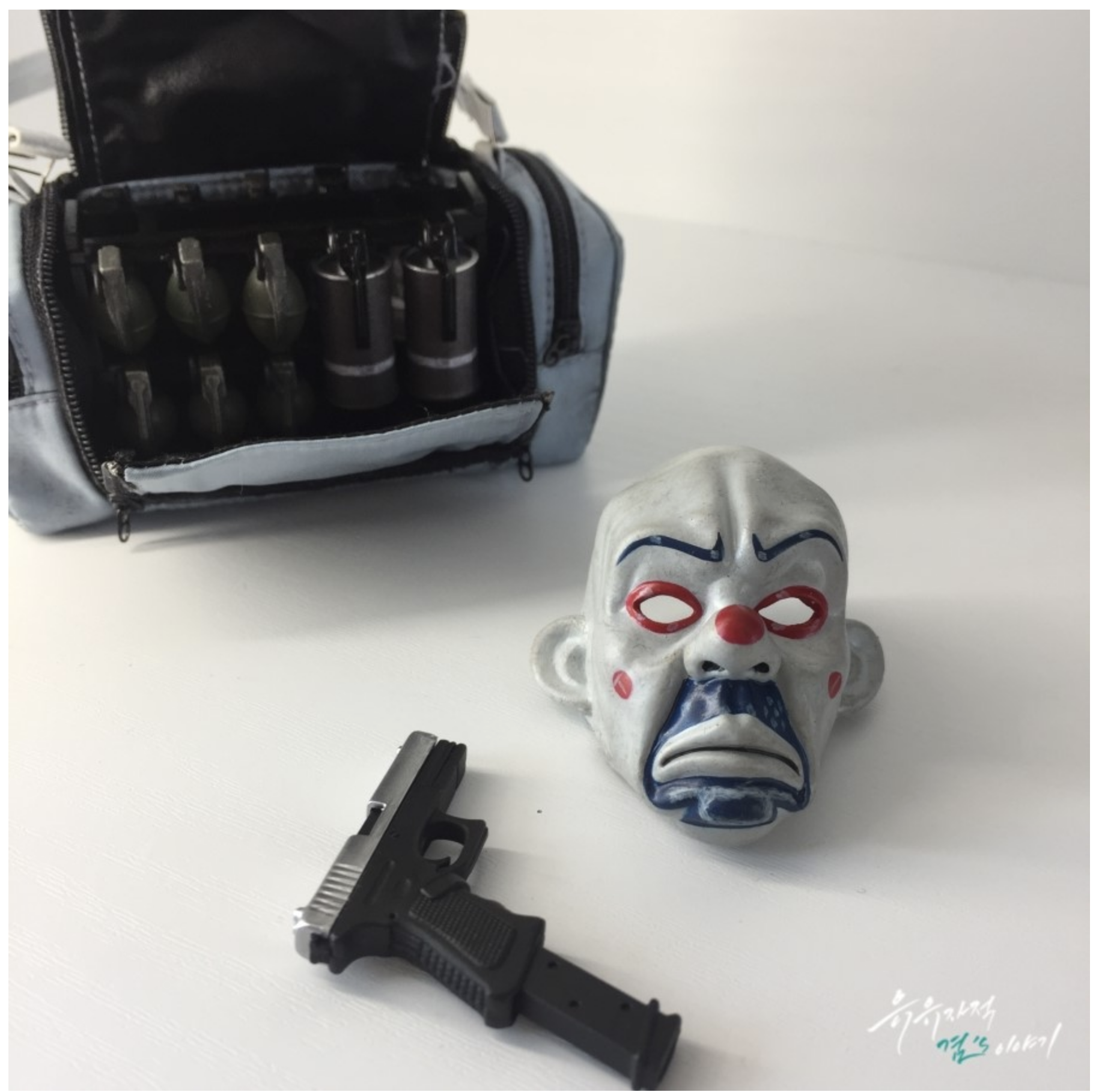 다크니아트 영화를 보신분들이라면 아시겠지만, 영화초반 은행을 털고 입안에 수류탄을 물리게 했죠. 이러한 섬세한 부분까지 루즈로 표현해두었습니다. 그외 돈다발, 샷건, 나이프, 권총까지 디테일 합니다. 극중에 나왔던 수류탄 가방, 수류탄핀을 모두 뽑을수 있으며 디테일도 상당히 좋습니다. 저번에 소개해드린 조커 DX11 제품보다 헤드퀄리티가 더 뛰어나다는평가를 받고 있습니다. 다만 아쉬운점은 고질적인 문제로 셔츠 가운데가 변색된다고 합니다. 퀄리티를 보면 괜히 프리미엄 붙는게 아니네요. 앞으로 하나하나 수집하겠지만 수어사 조커와 할리퀸도 구매하도록 노력해보겠습니다.
