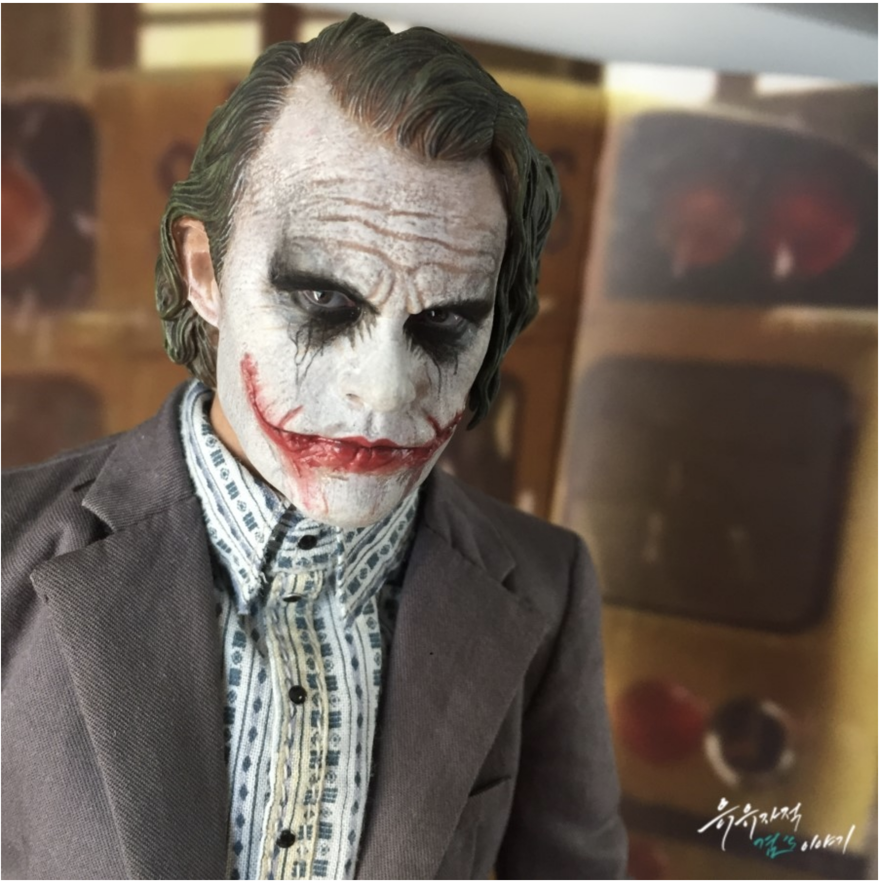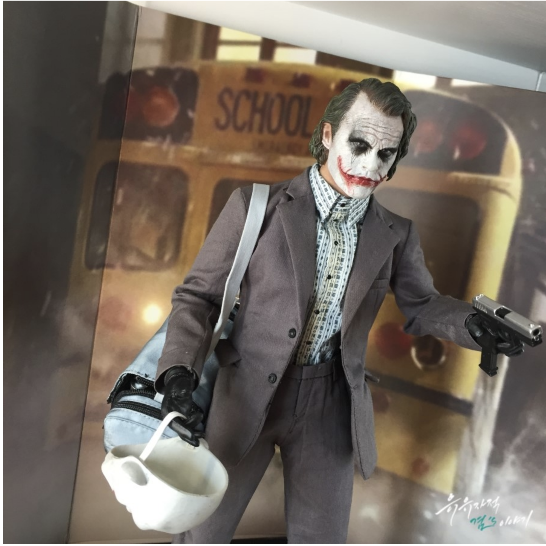 핫토이 조커 DX11에 이어서 핫토이 뱅크로버 2.0 이 제품은 히스레저 조커 제품중 가장 최근 2014년에 발매한 제품이며 히스레저 조커의 명품헤드와 토이페어 한정으로 발매했던 뱅크로버 2.0 조커입니다. 다크나이트 영화초반에 은행을 터는 조커의 모습을 그대로 재현했습니다.
